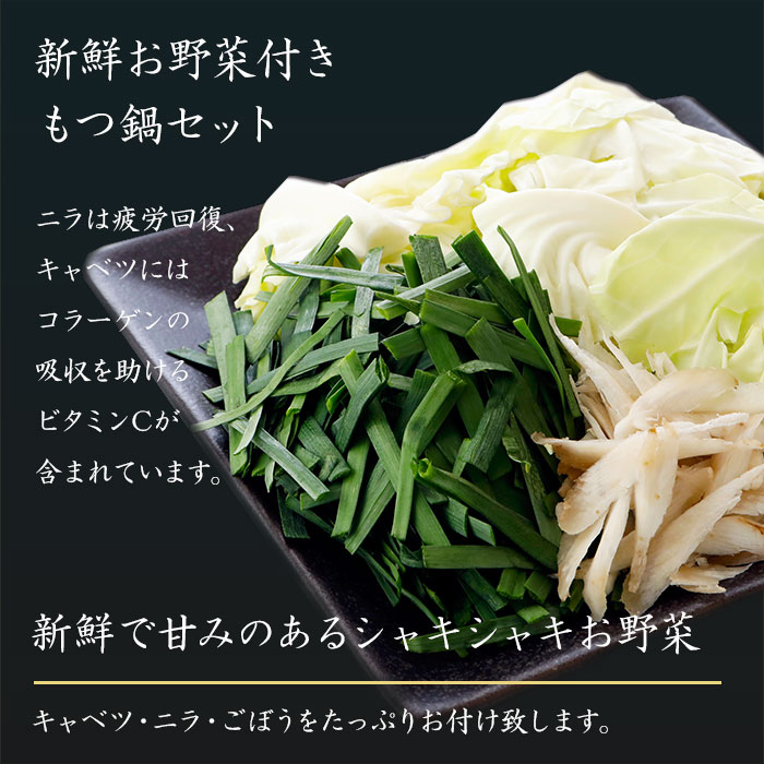キャベツ・ニラ・ごぼうのお野菜付き。届いてすぐ温めるだけで本場博多もつ鍋をご堪能出来ます。